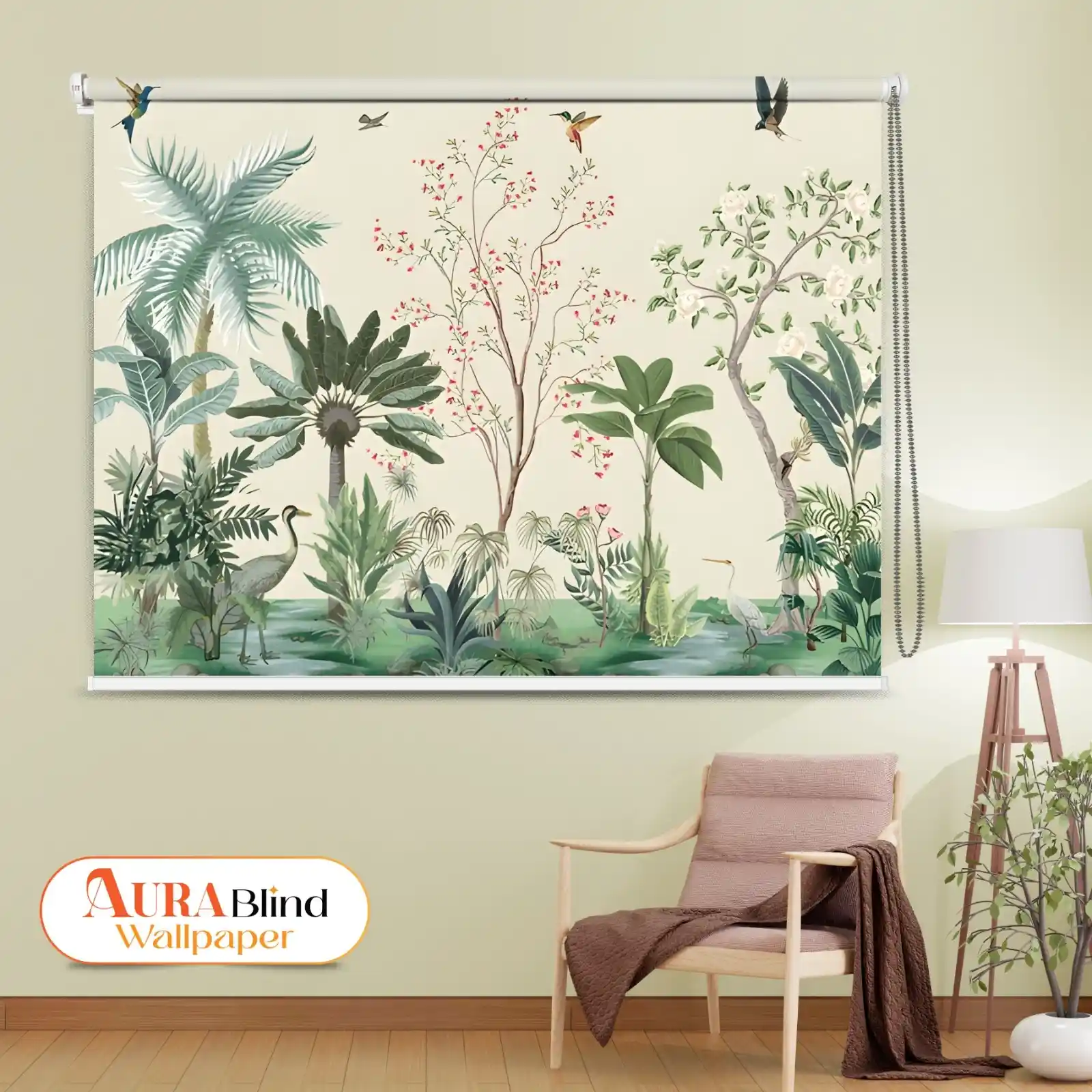 Create a calm, elegant atmosphere with this Botanical Tropical Garden Roller Blind. This Roller Blind is designed with delicate illustrated foliage, tropical plants, and graceful birds set against a soft sage-green background. The Blinds artwork feels light, airy, and refined, making it perfect for modern interiors that favor natural beauty without bold contrast.