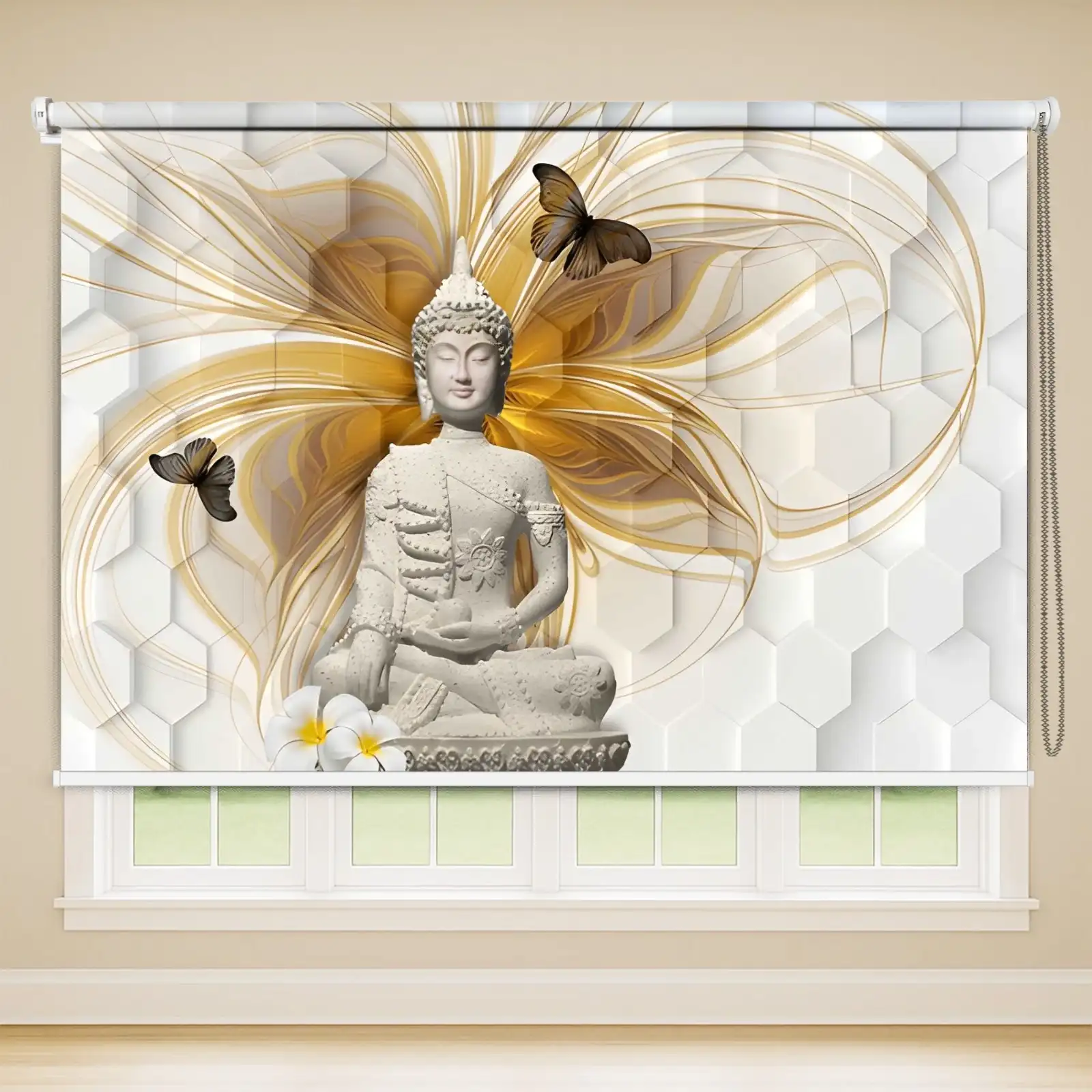 Divine Harmony White & Gold Buddha Roller Blind with Abstract Flow and Butterfly Accents