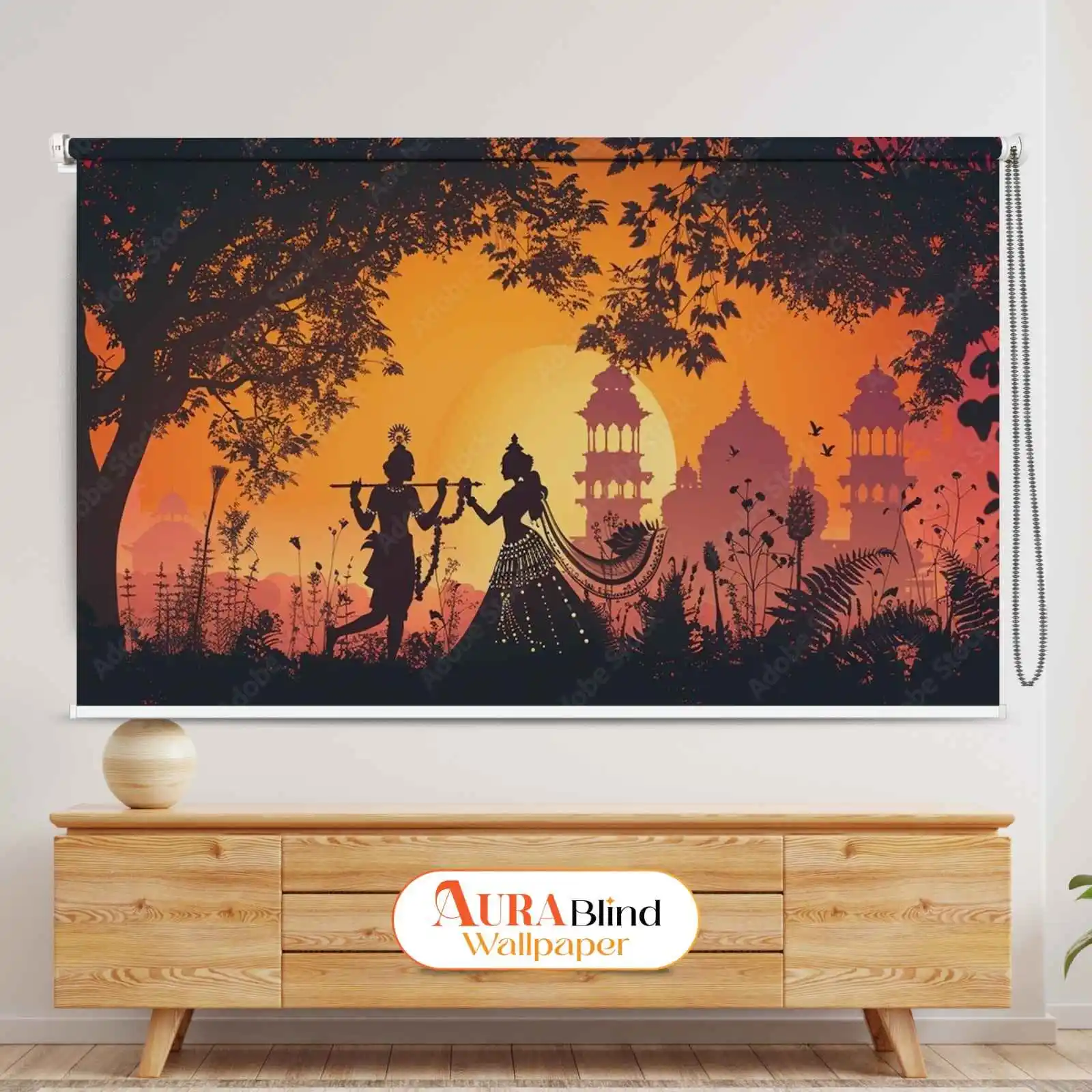 Bring a serene, divine charm to your home with this Divine Romantic Radha Krishna Sunset Silhouette Roller Blind. The stunning artwork captures the graceful silhouettes of Radha and Krishna against a glowing orange sunset, surrounded by temple architecture and lush foliage. This is a Perfect Rolller Blind for Pooja Rooms, Temples, living rooms, meditation spaces, or any corner where you want to add warmth, spirituality, and artistic elegance. Crafted with high-quality materials, this Mandir Roller Blind not only enhances aesthetics but also provides excellent light control and privacy.