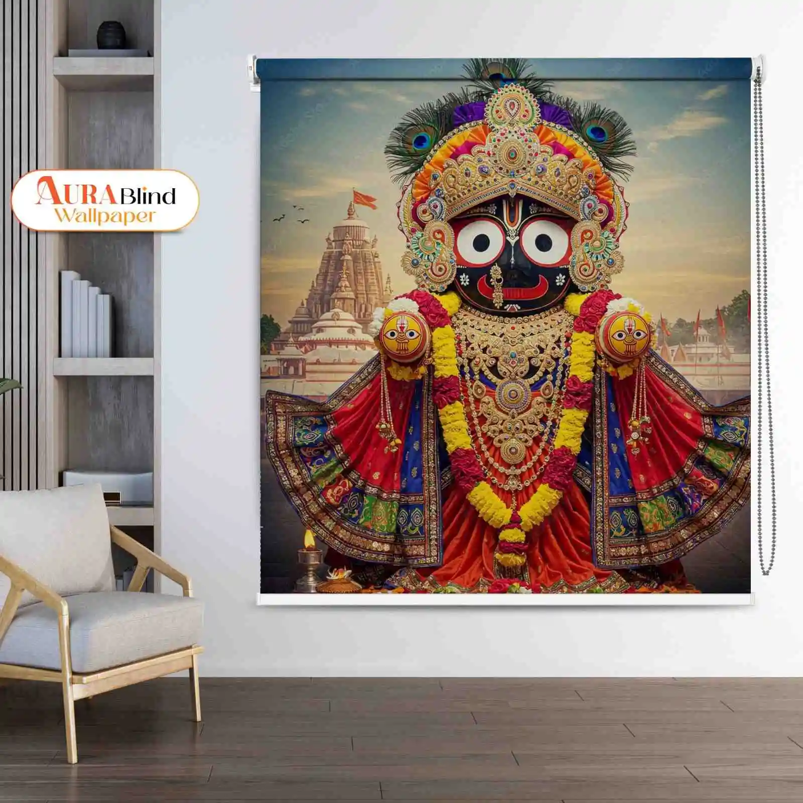 Decorate your interior with this Bhagwan Jagannath Temple and Pooja Room Roller Blind, beautifully adorned in vibrant traditional Indian attire, floral garlands, and intricate details inspired by the Jagannath Puri Temple. The backdrop of the sacred temple adds an authentic spiritual essence, making it a perfect choice for Prayer rooms, Temples, Meditation spaces, or as a unique decor piece in your home. Designed to blend devotion with elegance, this Mandir Roller window Blind brings blessings and positivity to your space.