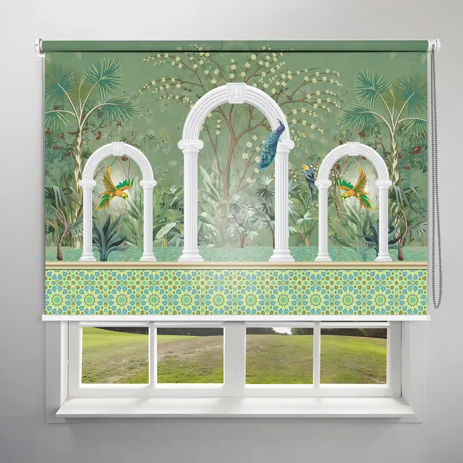 Bring home the elegance of classical Indian gardens with this Royal Garden Arches with Peacock Art Roller Blind, lush greenery, and vibrant peacocks. Inspired by heritage palace courtyards and serene Mughal-style landscapes, the design creates a soothing yet majestic ambiance for your interiors.