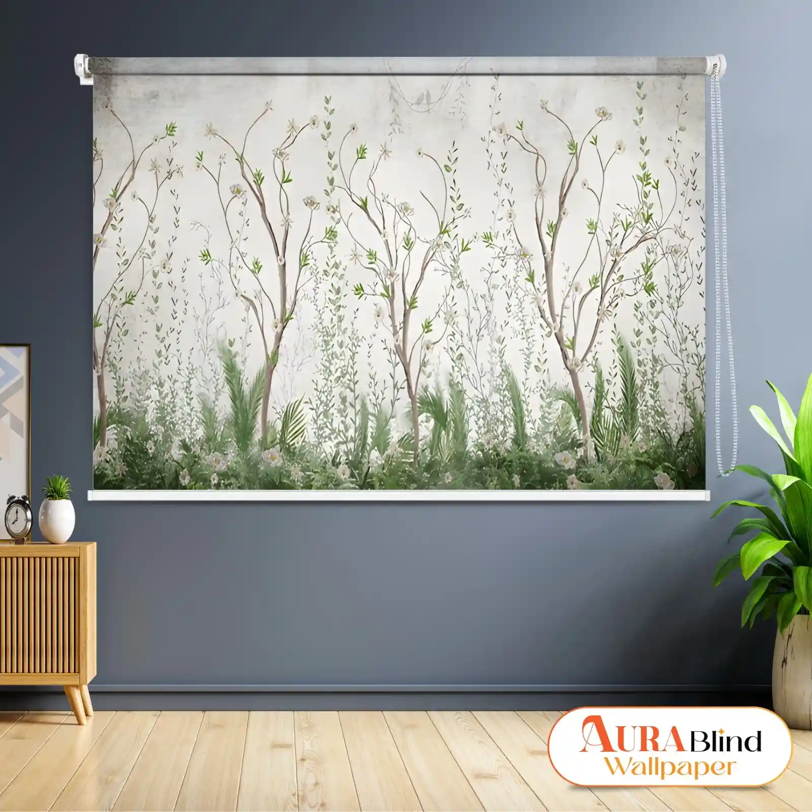 This Serene Forest Botanical Roller Blind for Living Room will add peace and natural beauty to your area. This living room window blind design offers a serene, natural atmosphere with its delicate pattern of thin trees, leafy branches, and subtle flora on a light, neutral backdrop. For modern, minimalist, Danish, and nature-inspired environments, this roller blind is ideal. This blind improves privacy by filtering light. It is perfect for both domestic and light commercial usage because of its calming colour scheme, which complements living rooms, bedrooms, study areas, and wellness areas.